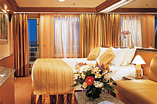These extra-large accommodations have a separate sitting area and private balcony. Special features include a large vanity/dressing table, refrigerator and entertainment area, VCR and access to an extensive video library, whirlpool bath and walk-in closet.