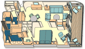A Concierge 2-Bedroom Suite with Verandah is an expanded stateroom for Guests travelling in larger parties (up to 7). Within a sizeable 945 square-foot space featuring refined art, classic Disney touches and elegant furnishings of natural wood and lavish fabrics, you enjoy luxury in abundance—enough to transport you to your own private paradise. Two elegant bedrooms, a complete living room and a master bathroom with a whirlpool tub round out the ideal retreat for you and your family.While all Disney Cruise Line staterooms boast luxury amenities and world-class service, guests of our Concierge Suites enjoy an expanded range of quality offerings, including:H20 Plus Spa, Bath and Shower ProductsFine bedding from Sealy Posturepedic and FrettePillow Talk ProgramSpecial treats delivered to your suiteAccess to a media library